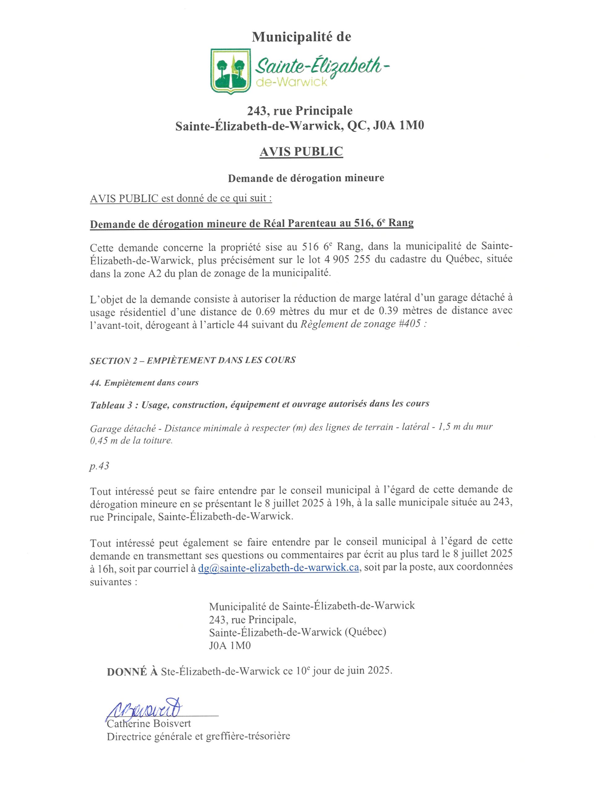 Avis public, Demande de dérogation mineure # 202401 de Roger Boissonneault et Line Groleau